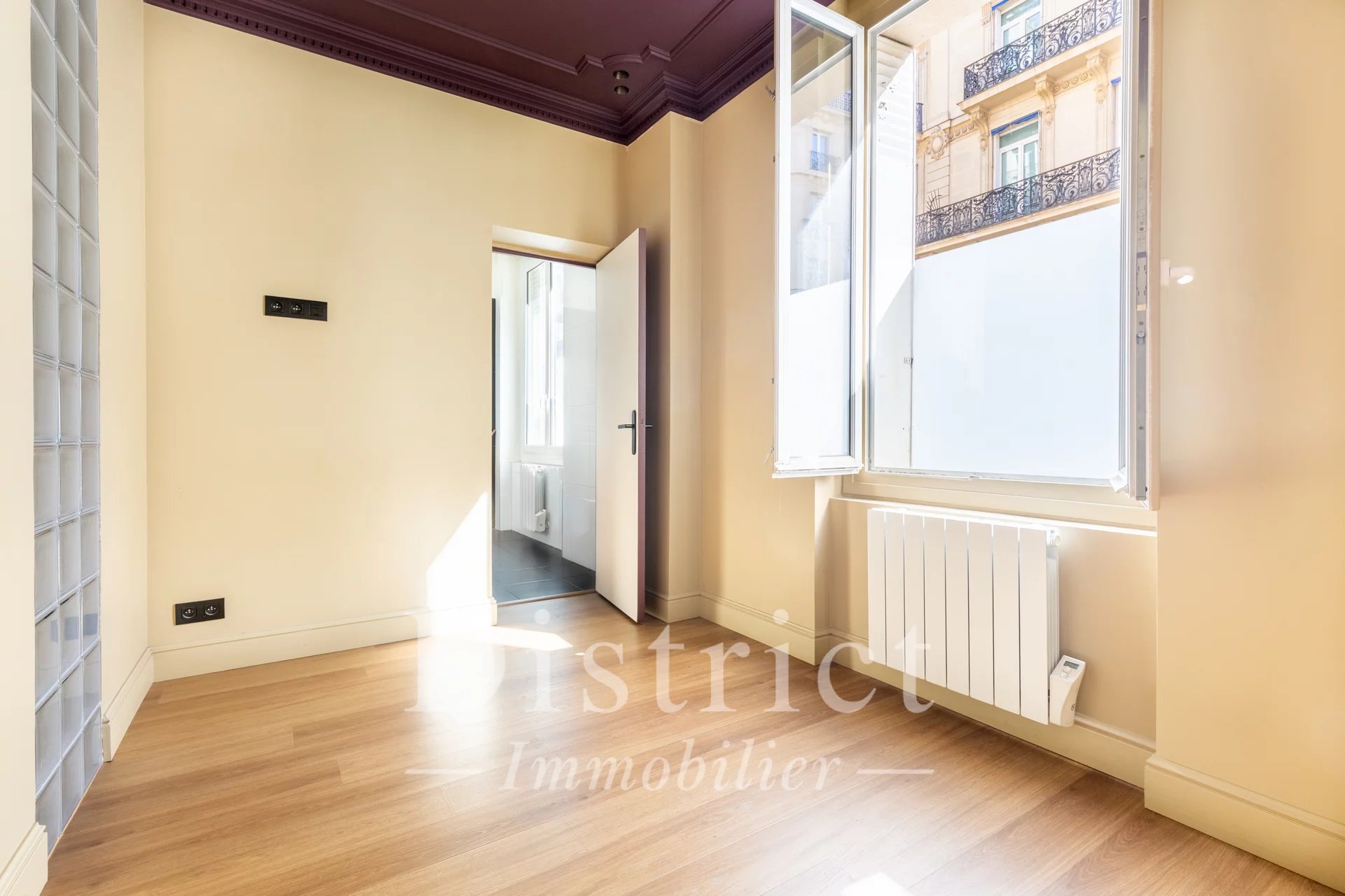 Exclusivité District George V. En plein cœur du Triangle d'Or, au rez-de-chaussée d'un magnifique immeuble Pierre de Taille, ce ravissant deux pièces de 27 m² est en parfait état. Donnant sur une rue large et calme, il se compose d'une entrée, un séjour, une cuisine indépendante, une petite chambre et une salle de douche avec WC. Il pourra être réaménagé très facilement en studio comme à l'origine. Idéal pied à terre, petits bureau ou professions libérales.