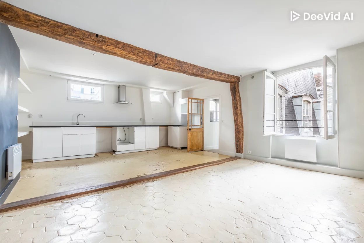 In the heart of the historic Marais district, close to the Hôtel de Ville, a charming 60.80 m² loi Carrez apartment in very quiet surroundings. It is located on the 3rd floor of a 16th-century building and benefits from courtyard views with double orientation. It comprises an entrance hall, a 33m² living/dining room with open-plan fitted kitchen. A beautiful 16m² bedroom with fireplace and fitted dressing room, a second small alcove bedroom of 3.63 m² (or ideally an office) and a shower room with WC. This apartment, in good condition, has retained its original features such as floor tiles, beams and half-timbering. They give it an undeniable charm. Access is via a large staircase with an attractive listed wrought-iron banister.