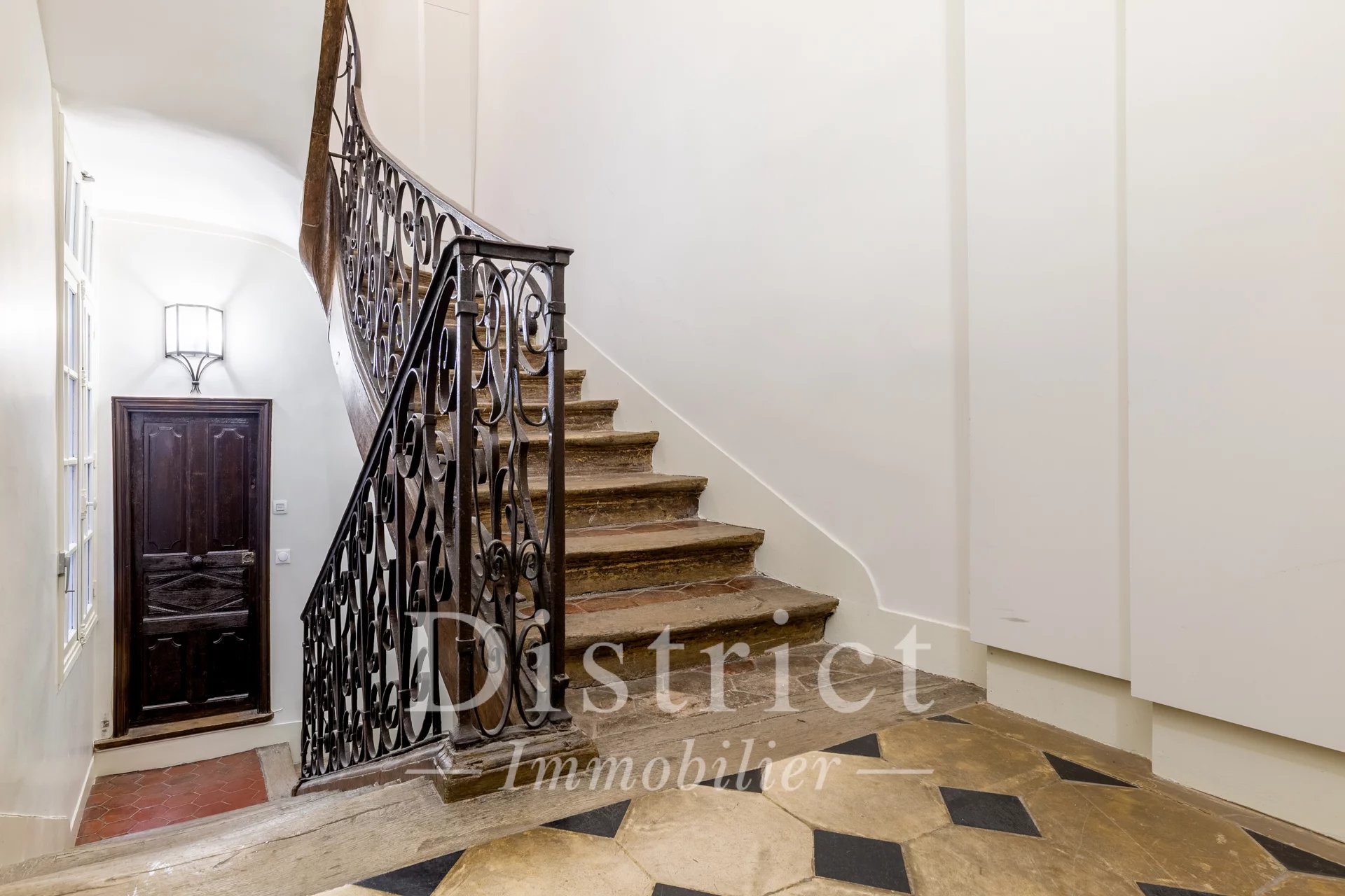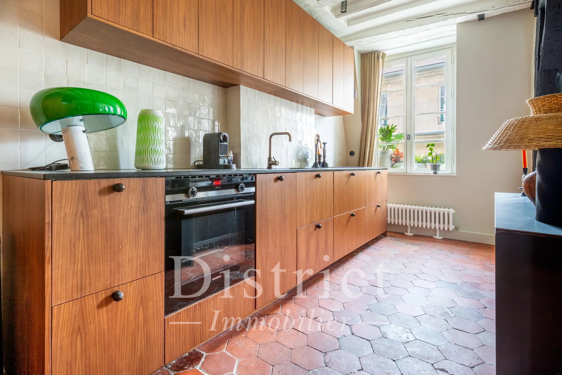 Exclusive. In a well-kept condominium on the 4th floor, this 58.66 m² loi Carrez apartment has been custom-renovated using quality materials. It comprises an entrance hall, a pleasant living/dining room, a kitchen with Zimbabwe granite worktop, a bedroom in absolute calm, a shower room also in black Zimbabwe granite. American walnut cupboards and partitions and a separate toilet. Plenty of storage space and a storeroom complete the ensemble. The original terracotta floor tiles, the fireplace and the clever layout give the apartment a warm, charming atmosphere.