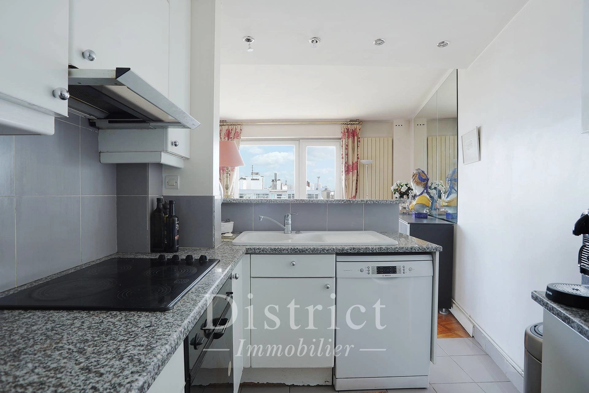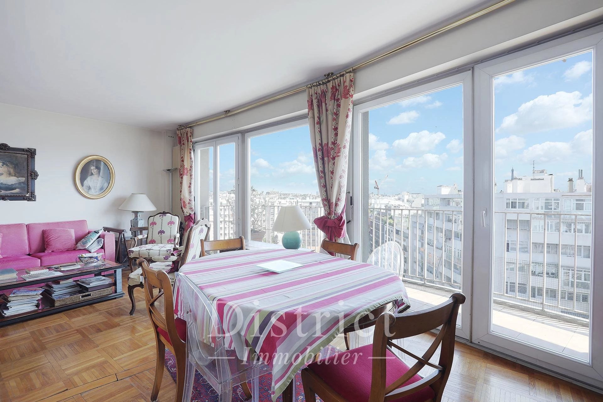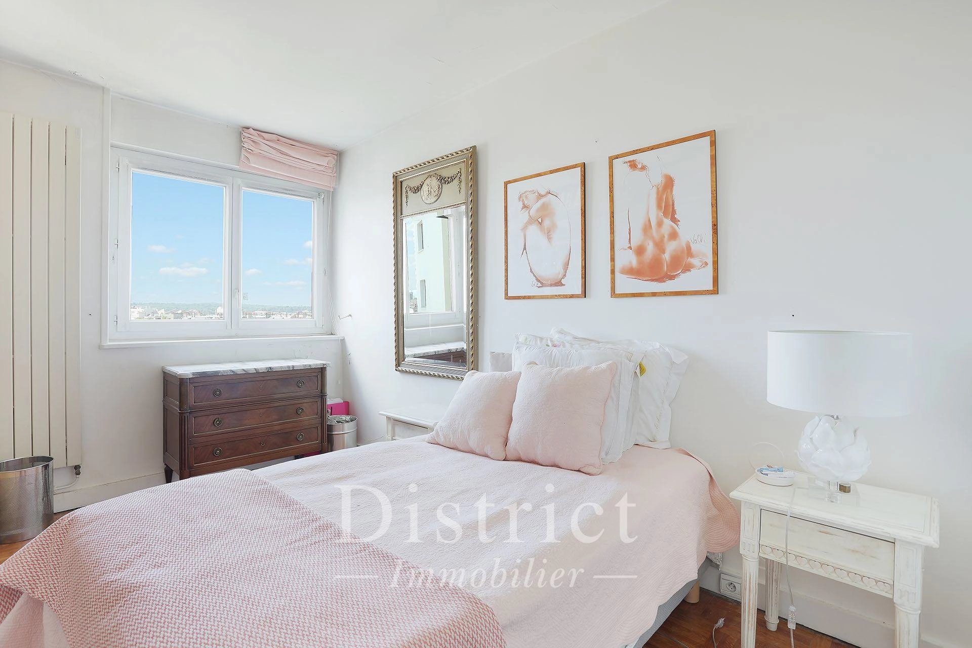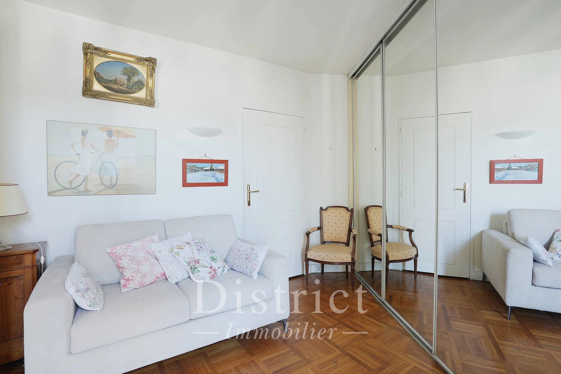 Général Delestraint / Exelmans. This floor through apartment on the 9th floor of a luxurious mid 20th century residence offers 84.41 sqm of living space as defined by the Carrez Law. It includes a living/reception room and dining room opening onto an east-facing balcony enjoying an exceptional view of the capital, a fitted and equipped semi open-plan kitchen, two bedrooms (one with a balcony enjoying an open view), a spacious shower room and a separate toilet. With a walk-in closet and fitted cupboards. Cellar. A peaceful and sunny apartment in a prime location. The District group has 5 agencies in prime locations in the capital’s most prestigious neighbourhoods : Ile Saint Louis, Saint Germain des Prés, Champ de Mars, 8th District Golden Triangle, and Parc Monceau. Since 1997, we have been managing a carefully selected portfolio and offering the best assets on the market. Our services include the sale, acquisition, rental and management of real estate assets.